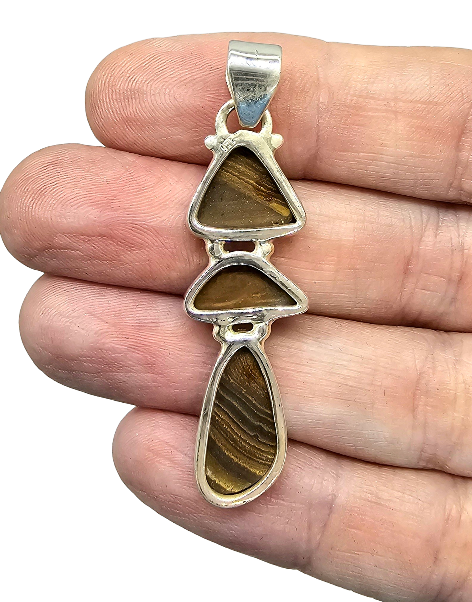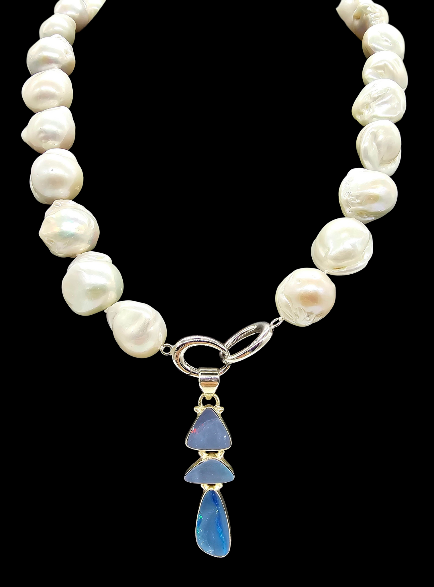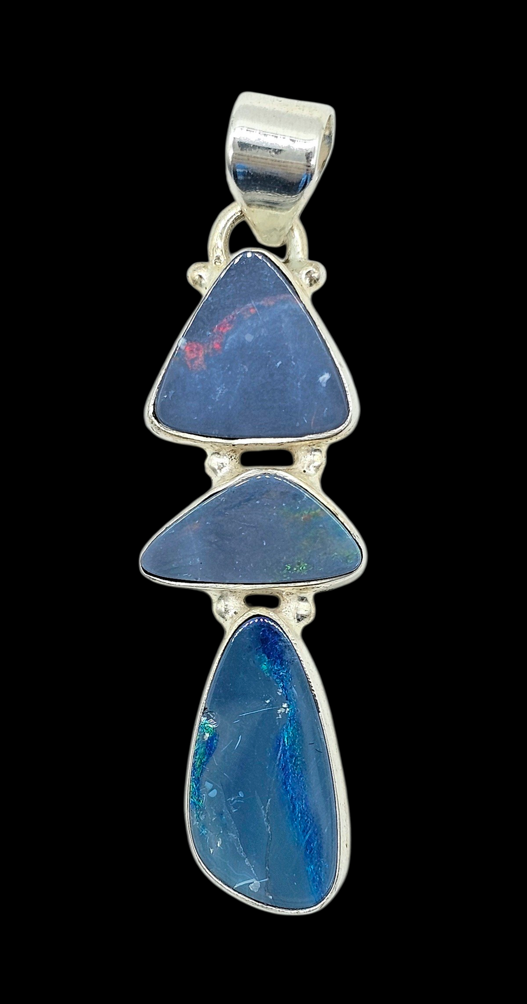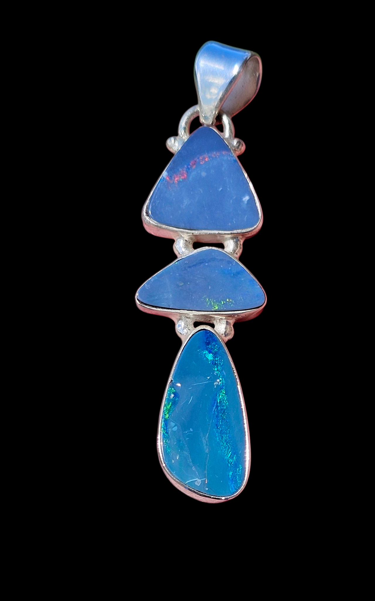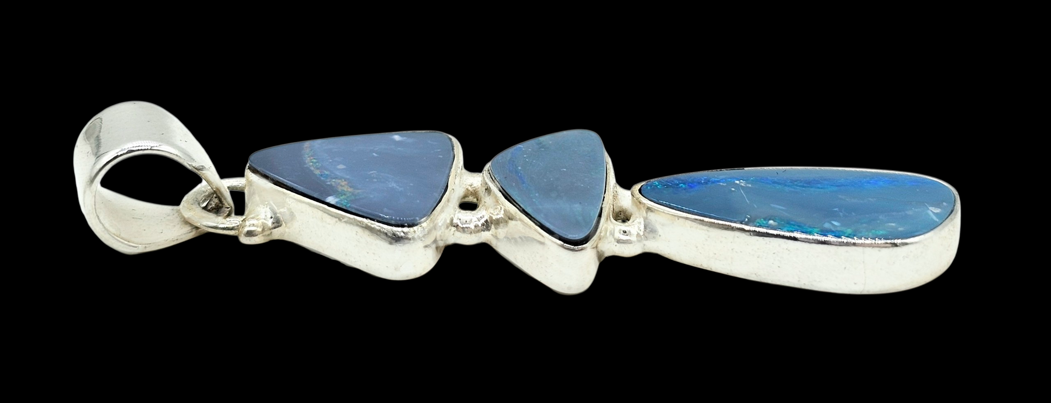 This striking Australian Opal doublet pendant is beautifully set in polished sterling silver. It features three unique opal stones that shimmer with flashes of deep ocean blue, electric green and fiery hints of red. Each natural opal is completely one-of-a-kind, creating a flowing, sculptural design that catches the light with every movement. In metaphysical traditions, opal is known to enhance creativity, intuition and positive energy while helping the wearer express their true self. Elegant, mystical and distinctly Australian, this pendant is a captivating piece that carries both beauty and meaning. ✨