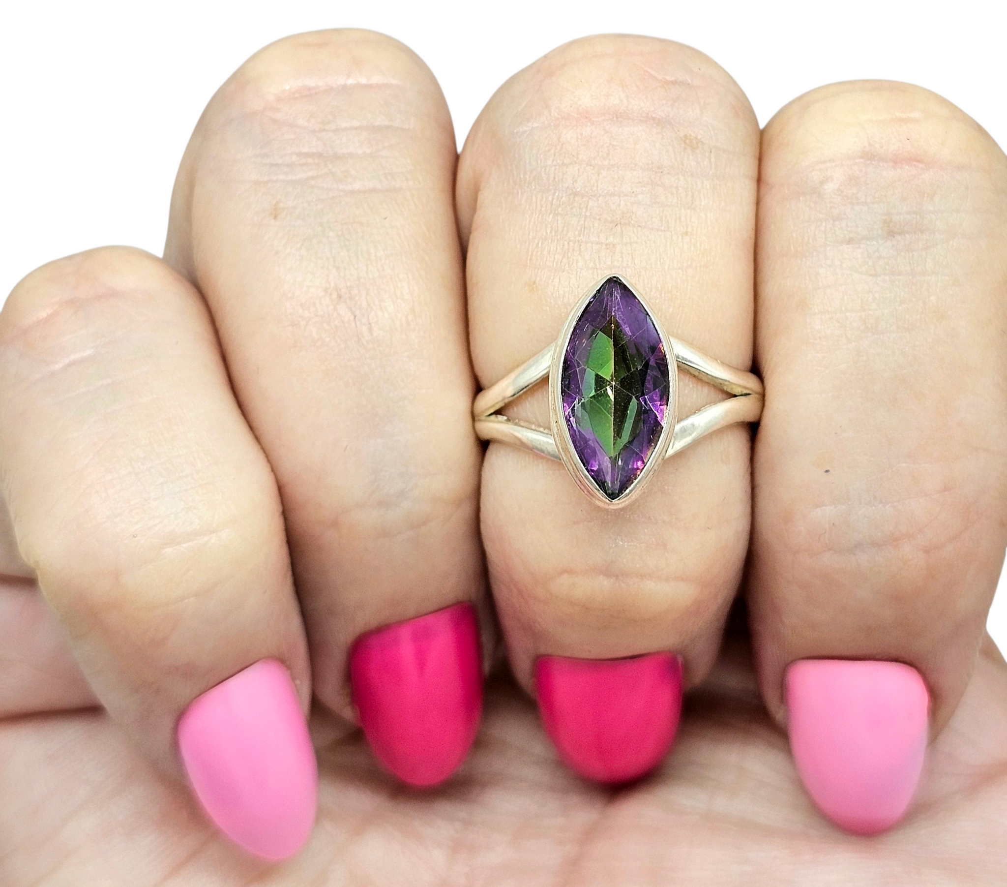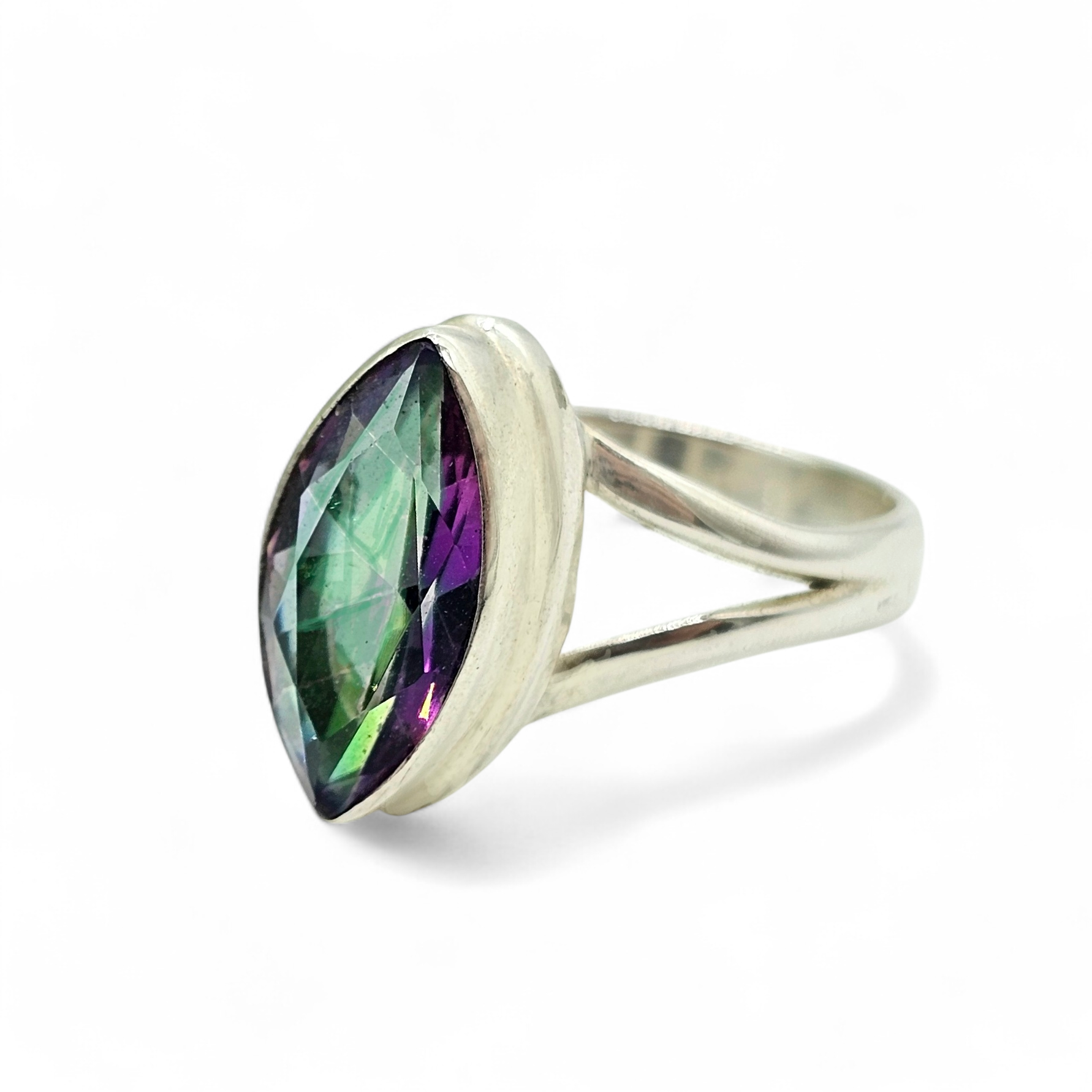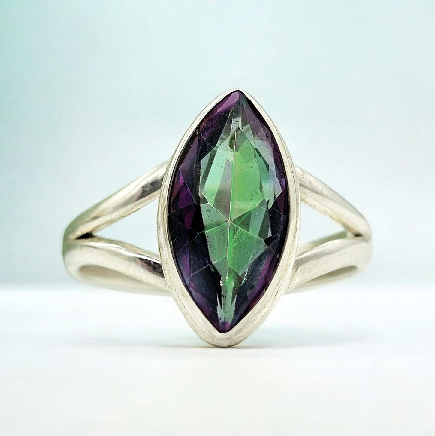 5 carat Mystic Topaz Ring, Marquise Shape, Size 7 3/4, Sterling Silver, Purple / Green Gemstone, Fire Topaz, Rainbow Topaz, Alaskan Ice