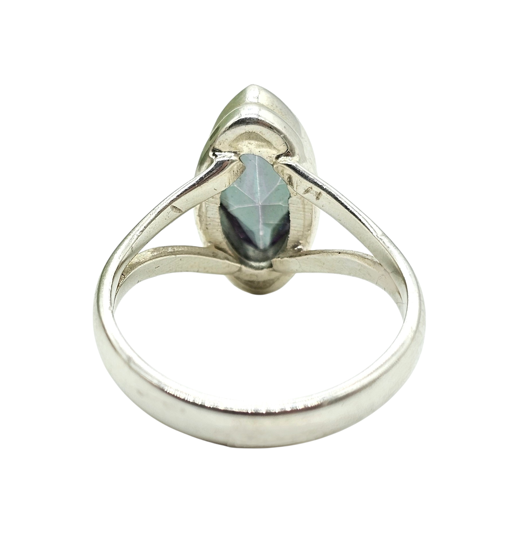 This exquisite ring is showcasing a beautifully faceted marquise-cut mystic topaz that flashes mesmerising hues of violet, emerald green and deep plum as it catches the light. Set in luminous sterling silver, the elegant split-shank band enhances the stone’s elongated shape while adding a refined, contemporary feel. The mystic topaz’s ever-changing colour play gives this ring a magical, almost otherworldly presence, making it perfect for someone who loves unique, eye-catching jewellery.