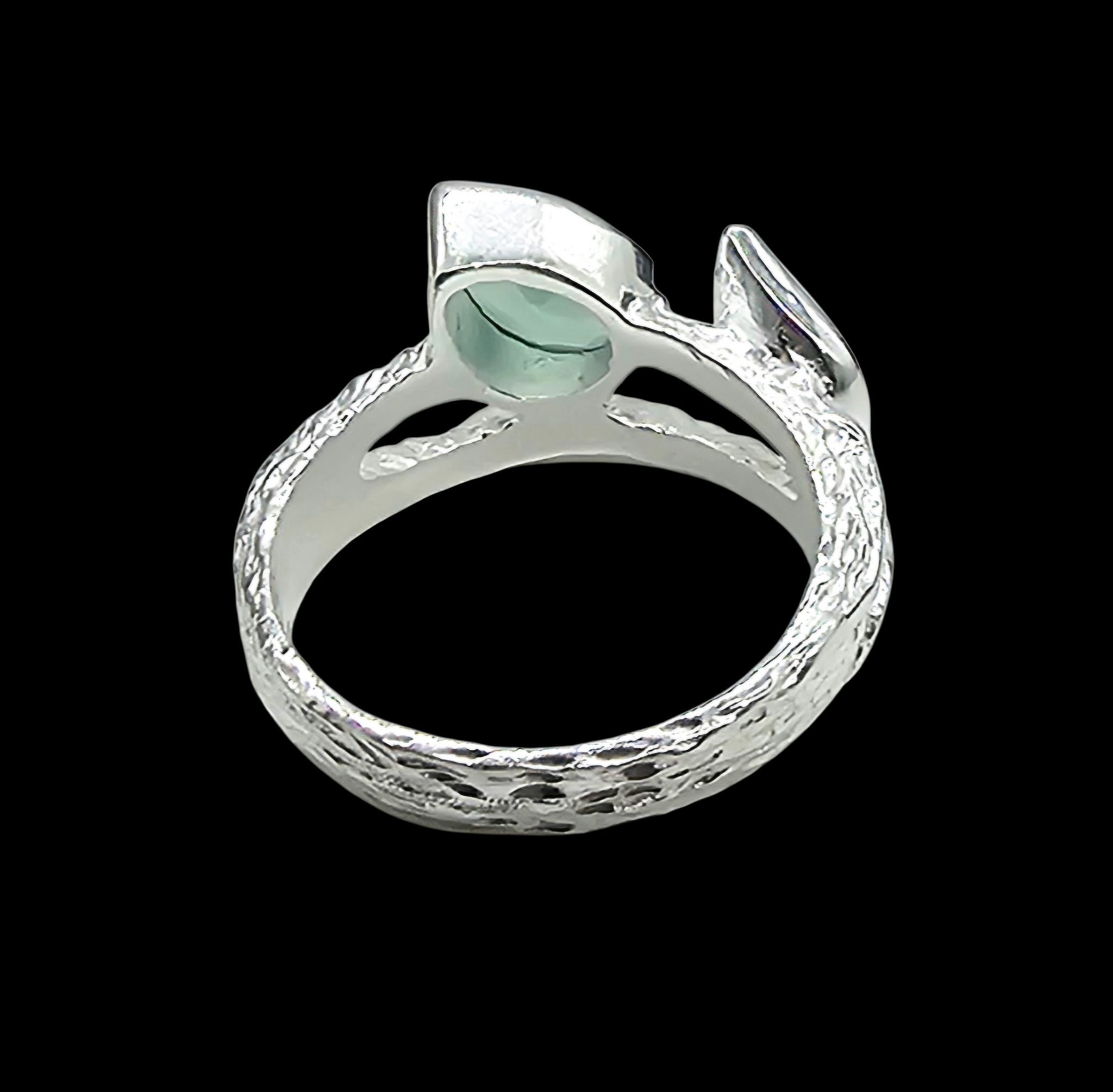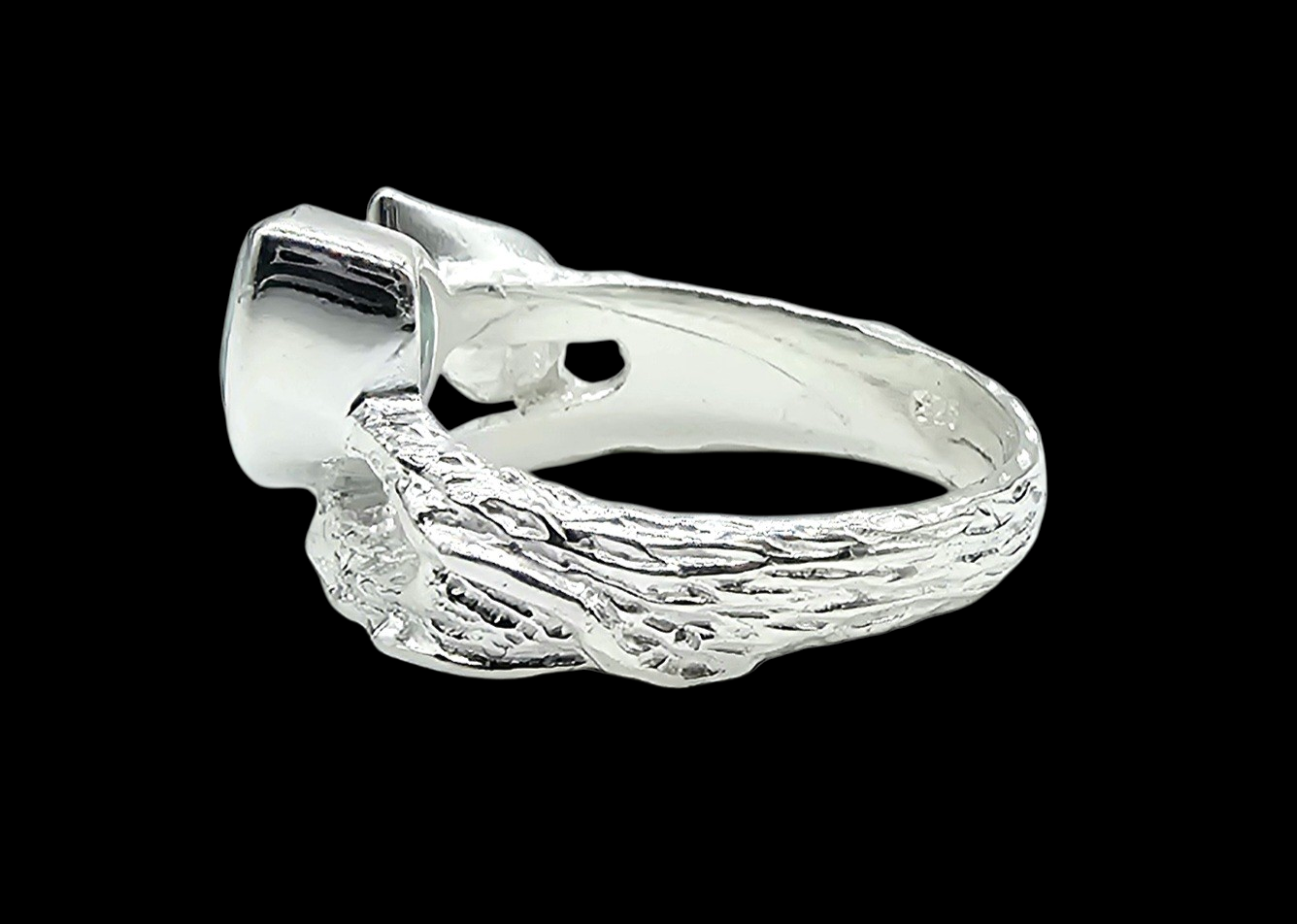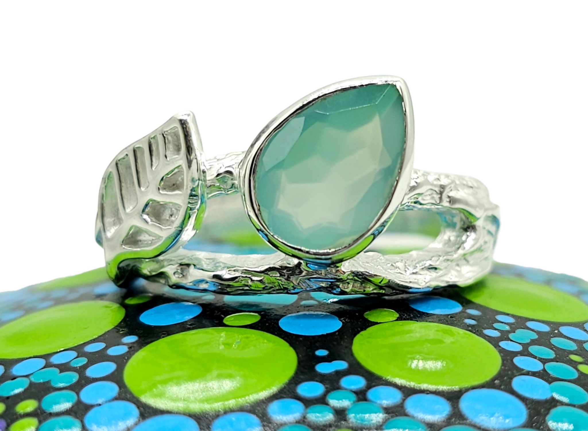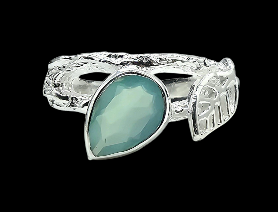 Effortlessly elegant, this Blue Chalcedony ring features a dreamy pear-cut gemstone set in textured sterling silver with delicate leaf detailing. Known as the “stone of calm communication,” Blue Chalcedony is believed to promote peace and encourage thoughtful expression, making it perfect for those who lead with kindness and clarity. Its gentle aqua glow catches the light beautifully, while the organic silver band adds a natural, earthy charm — a timeless piece that feels both soothing and sophisticated.