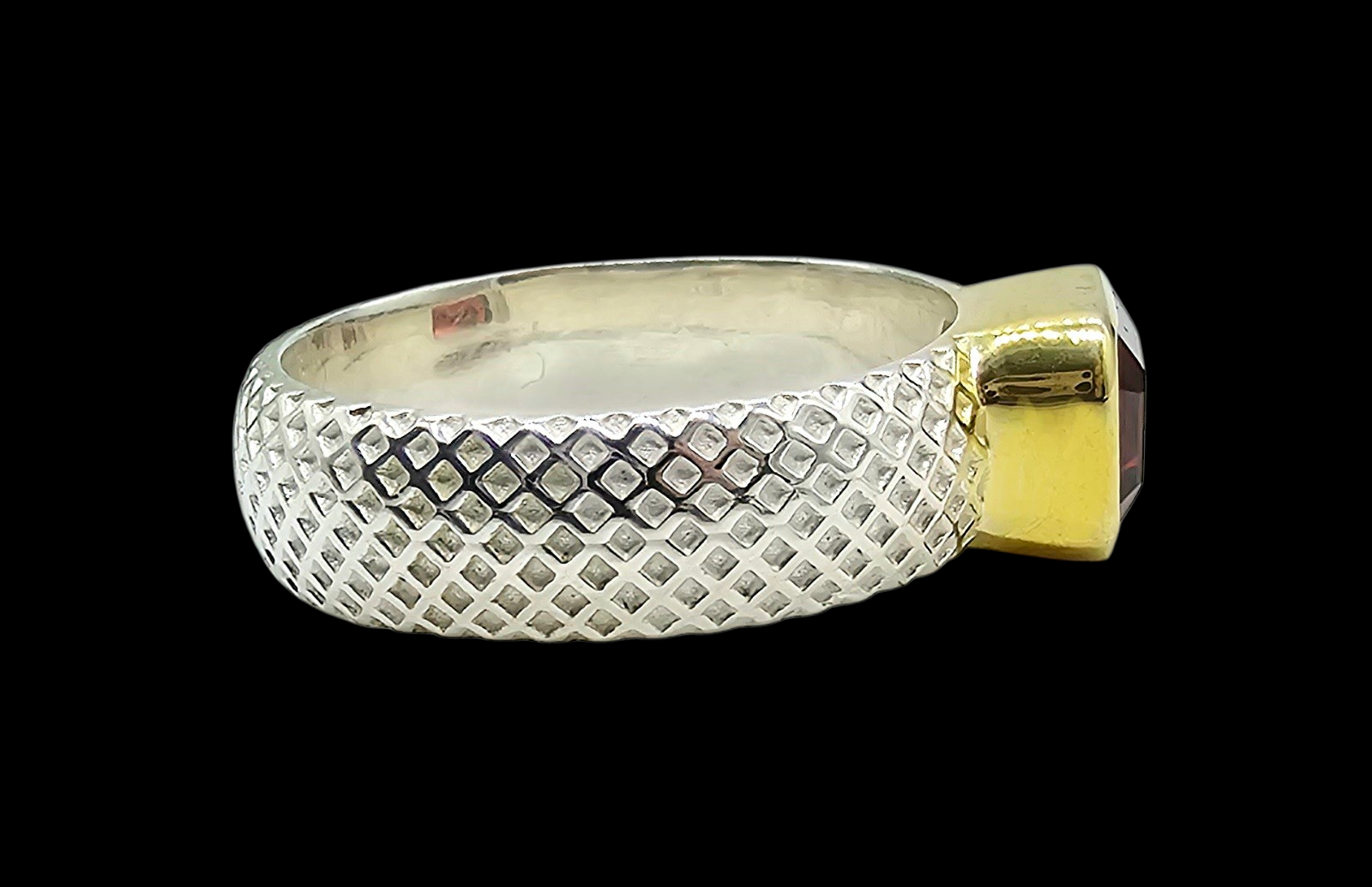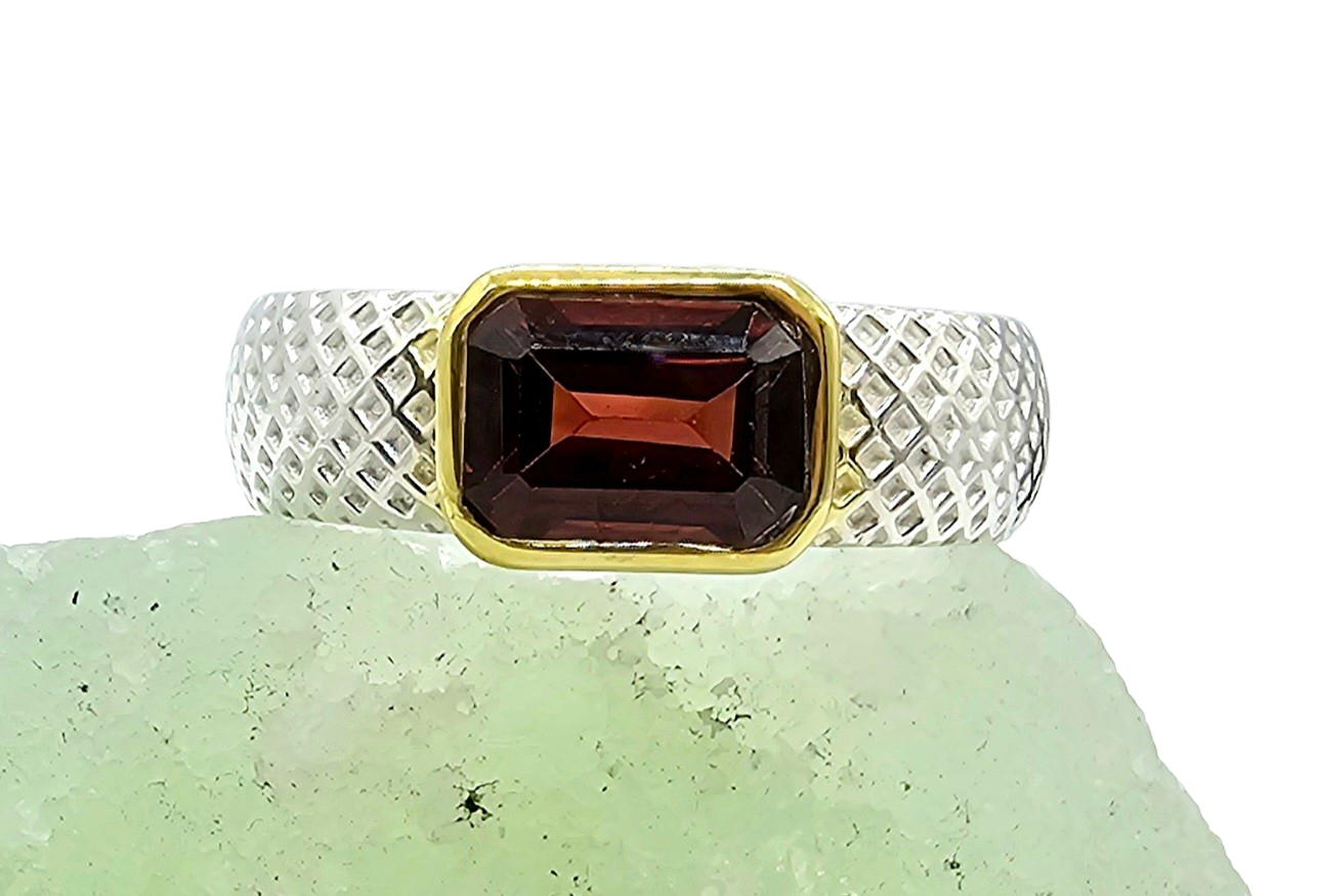 This striking ring features a rich, deep red garnet in a sleek rectangle cut, glowing with warm wine-coloured flashes as it catches the light. The gemstone is set in a luxurious gold-plated bezel that beautifully frames its depth and brilliance, creating a stunning contrast against the textured sterling silver band. The intricate cross-hatch detailing along the band adds a contemporary edge. Bold yet elegant, this garnet ring is a timeless statement piece