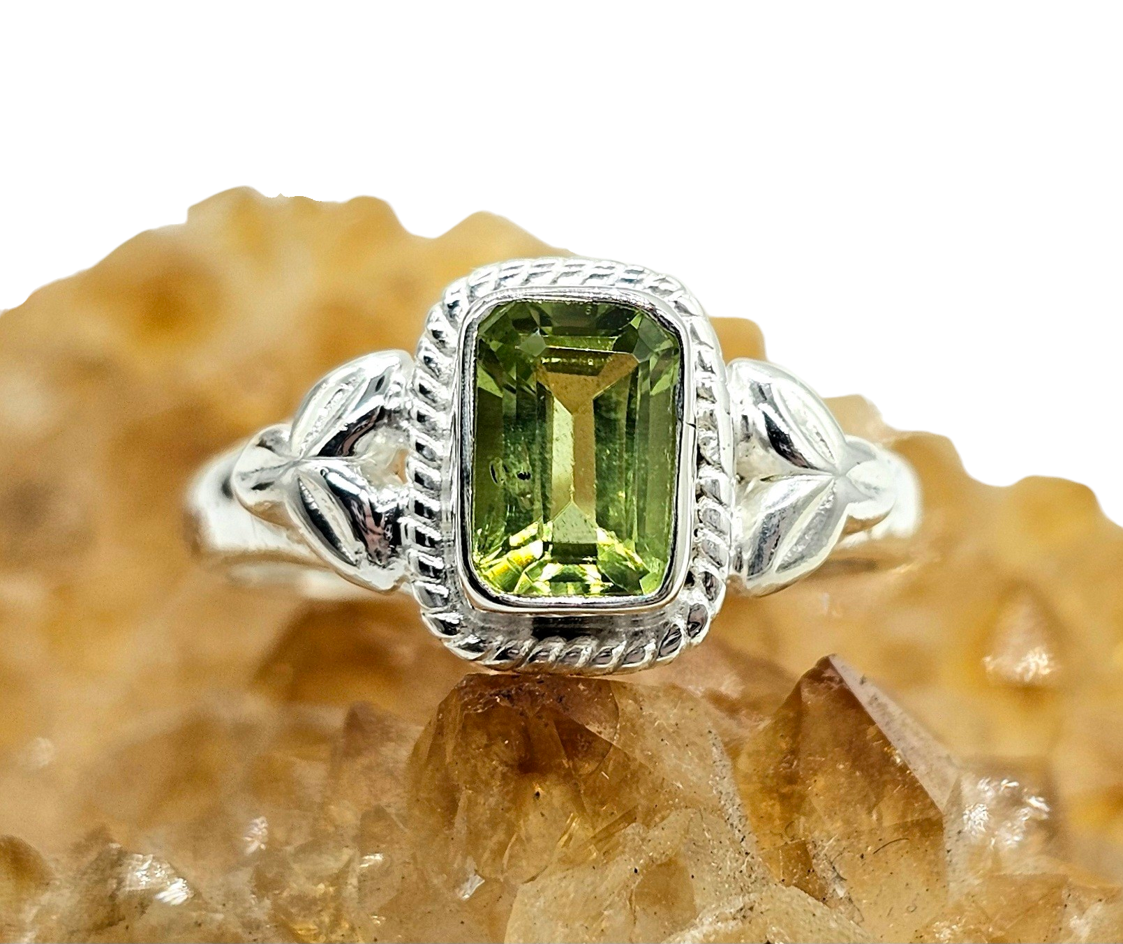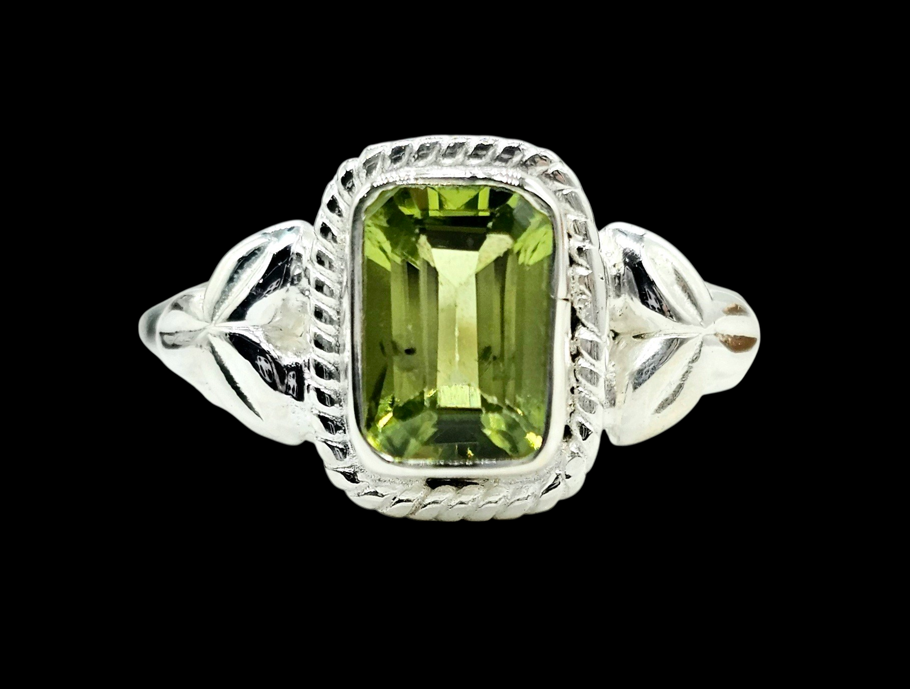 This stunning Peridot ring features a vibrant emerald-cut stone glowing in fresh lime-green tones, framed by elegant rope detailing and delicate leaf accents on the band. A perfect August birthstone piece or uplifting statement ring, itβs timeless, eye-catching, and beautifully crafted. πβ¨