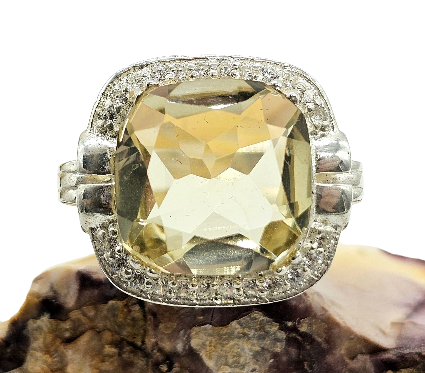 Halo Lemon Quartz & Zircon Ring, Size 11, Cushion Square Facet, 8.5 carats, Sterling Silver, Mental Clarity, Confidence Gem, Lucky Stone