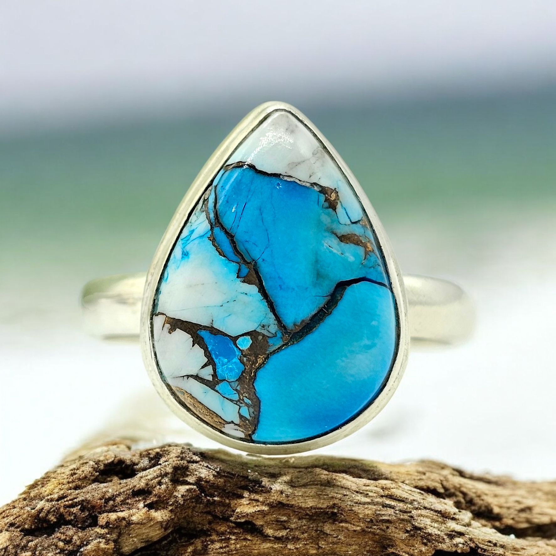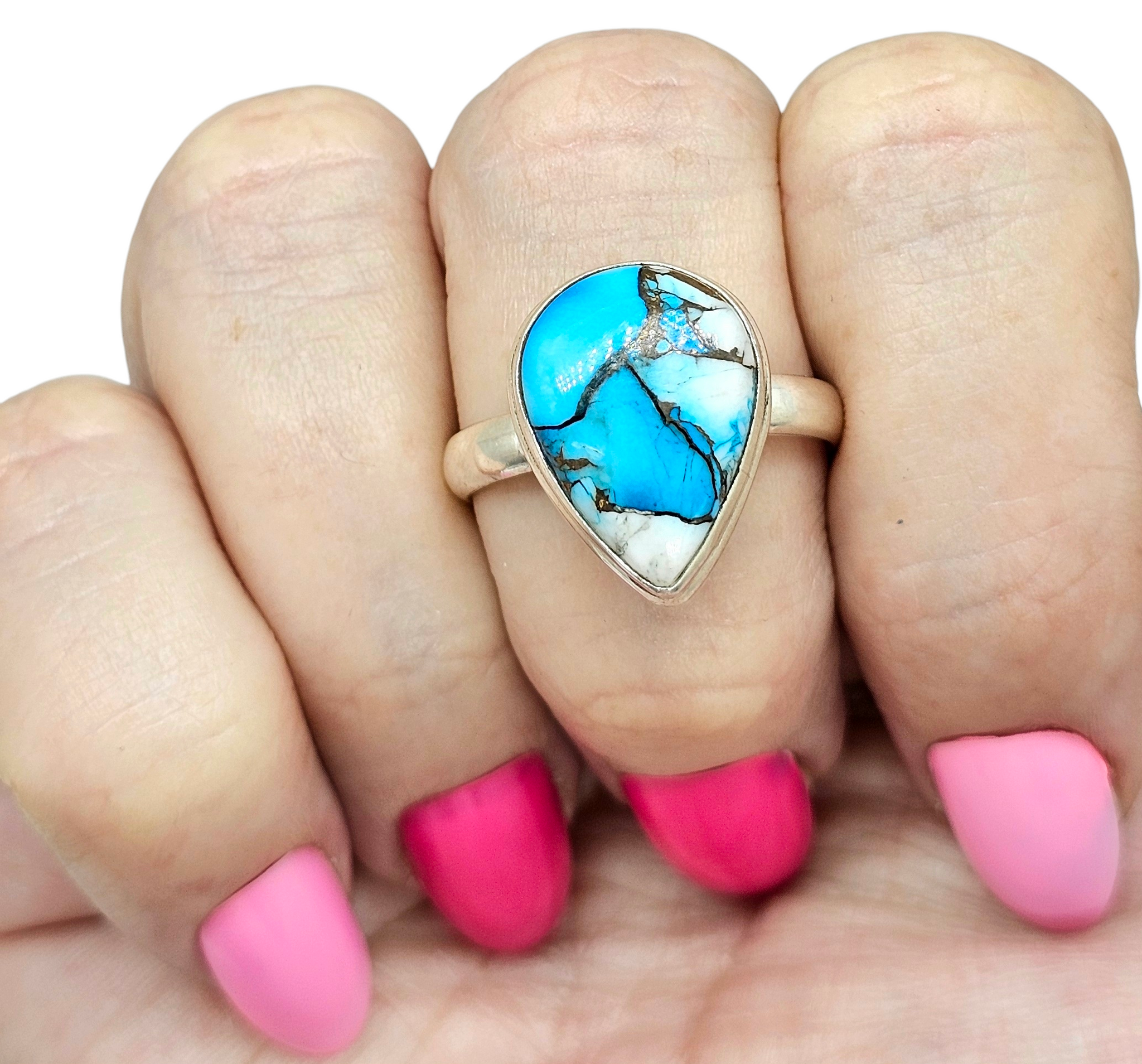 Ice Blue Dahlia Turquoise Ring, Size 10.75, Sterling Silver, Pear Shape, Copper Turquoise, Protection, Love Stone, December Birthstone
