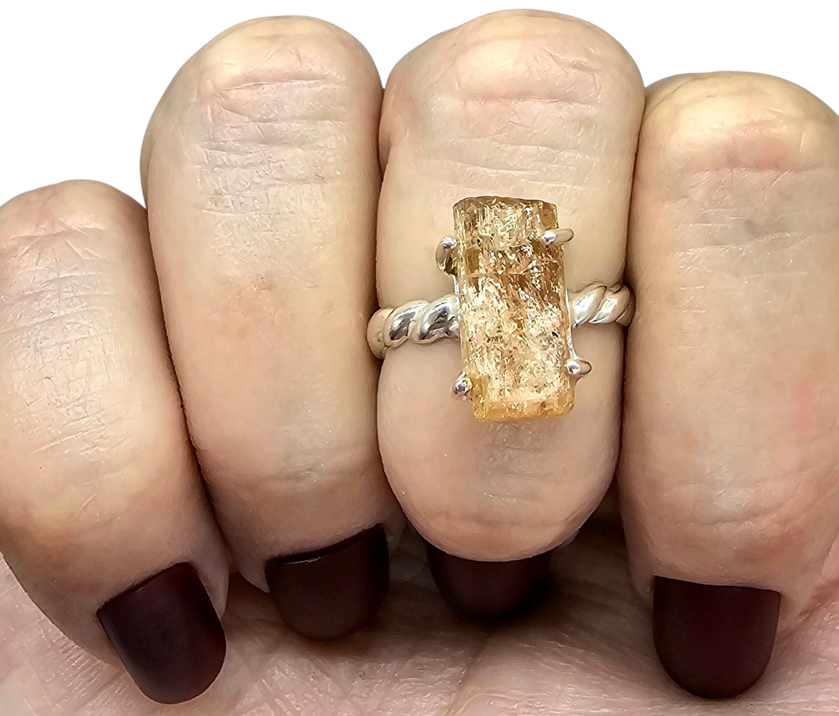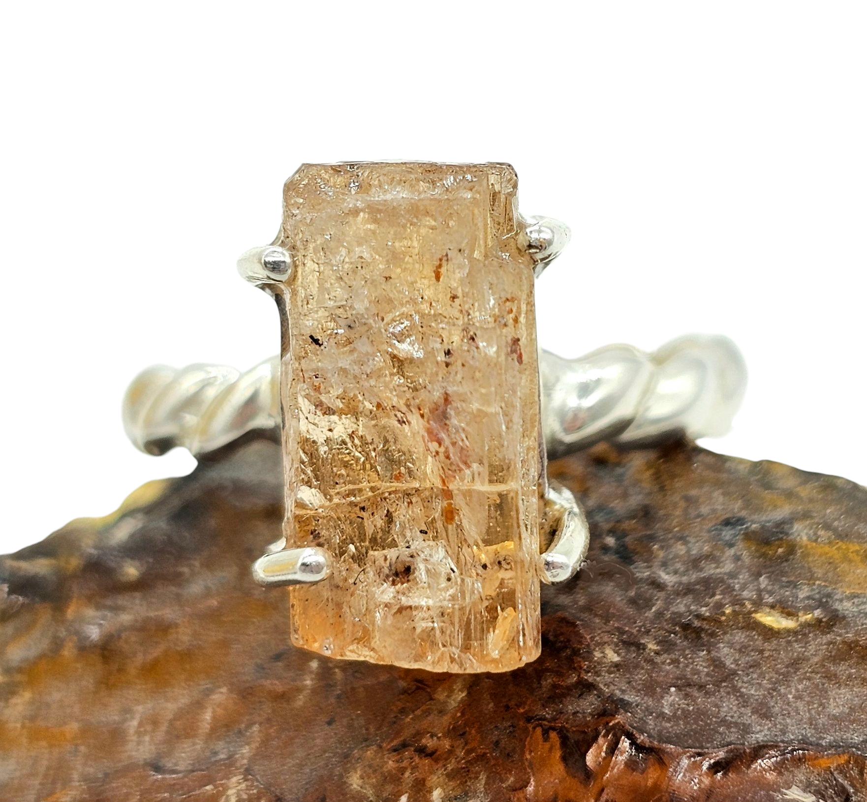 Rough Imperial Topaz Ring, Size 8, Sterling Silver, Raw Gemstone, Twisted Band, Rectangle Design, Manifestation Stone, Solar Plexus Chakra