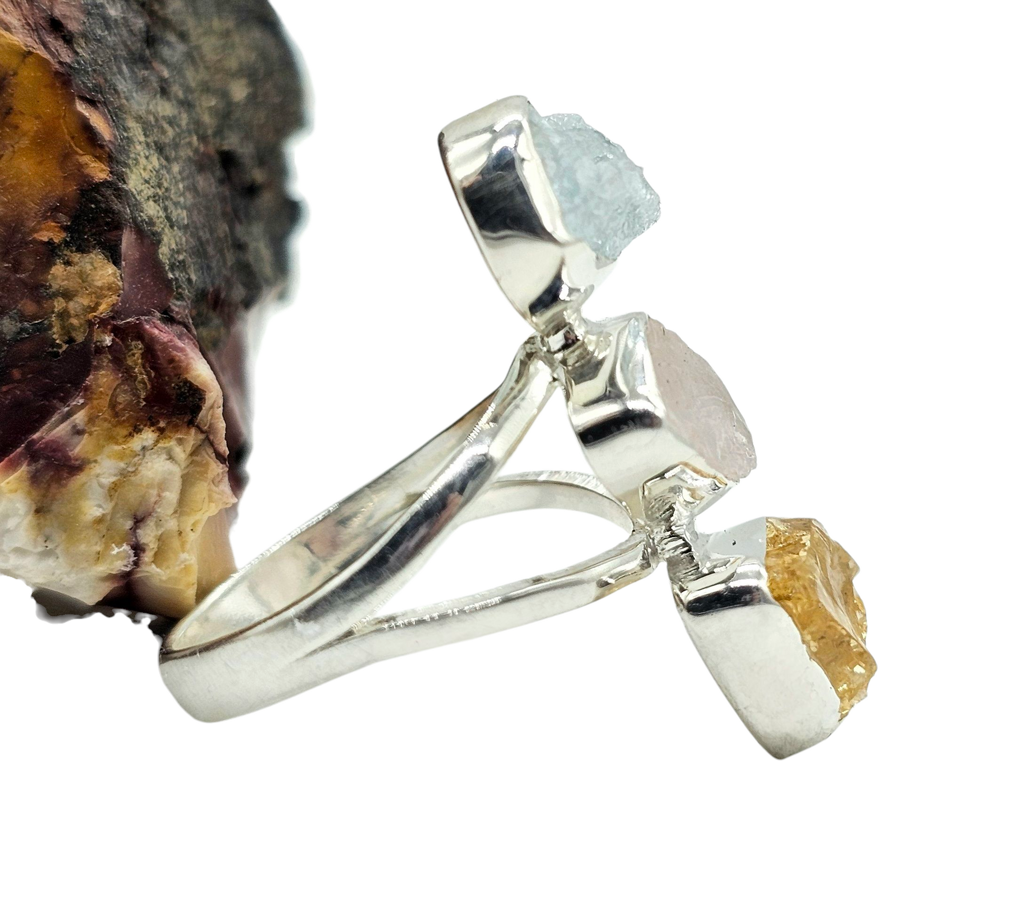 Raw Aquamarine, Rose Quartz & Citrine Ring, Size 7, Sterling Silver, March and November Birthstones, Rough Gemstones, Three Stone Ring