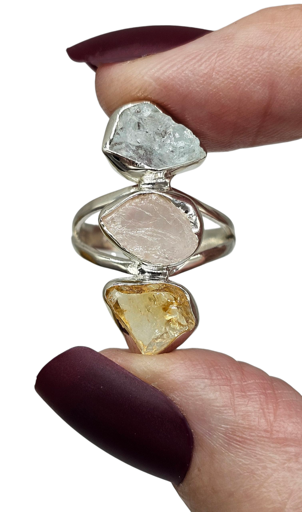 Indulge in luxury with our Raw Aquamarine, Rose Quartz & Citrine Ring. Crafted with sterling silver, this size 7 ring features rough gemstones of March and November birthstones. The three stone design exudes elegance and sophistication, making it the perfect statement piece for any occasion. Adorn yourself with natural beauty and positive energy.