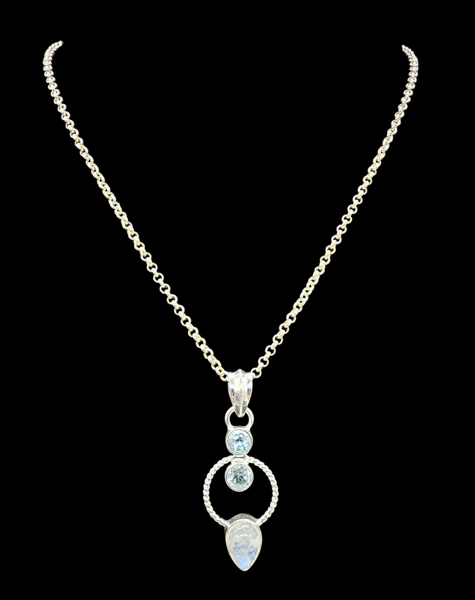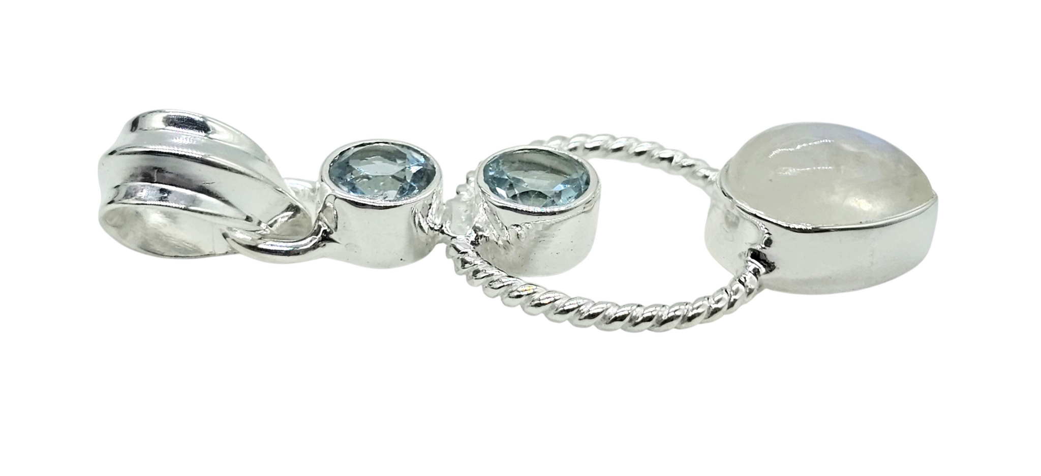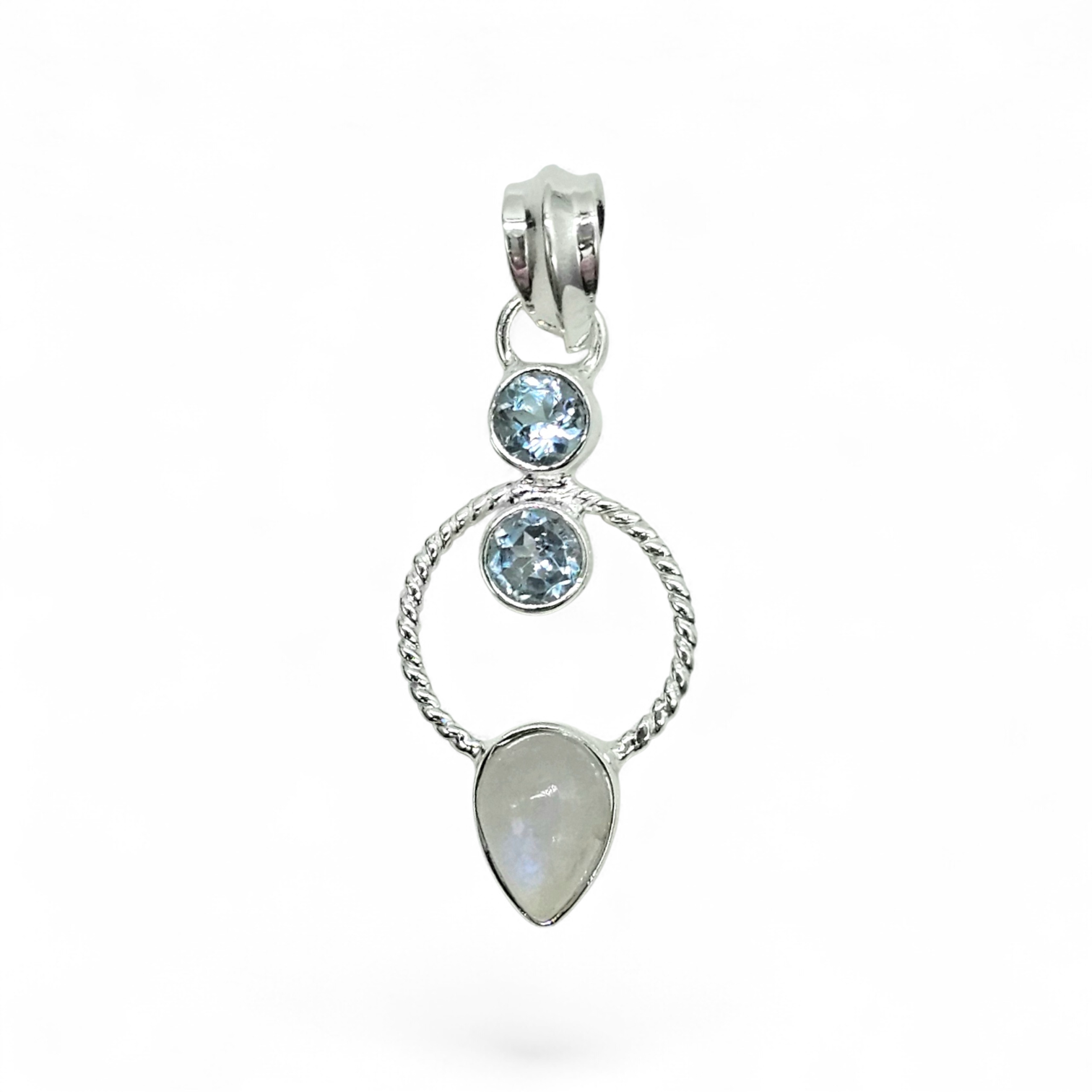 This Rainbow Moonstone & Blue Topaz pendant in 925 sterling silver is pure magic ✨ The luminous moonstone flashes with ethereal blue fire, beautifully framed by a delicate twisted silver circle, while sparkling blue topaz accents add a crisp, icy brilliance above. Elegant yet unique, this piece catches the light from every angle and feels effortlessly feminine—perfect for everyday wear or as a meaningful gift symbolising intuition, calm, and clarity. A true standout that looks even more stunning in person.