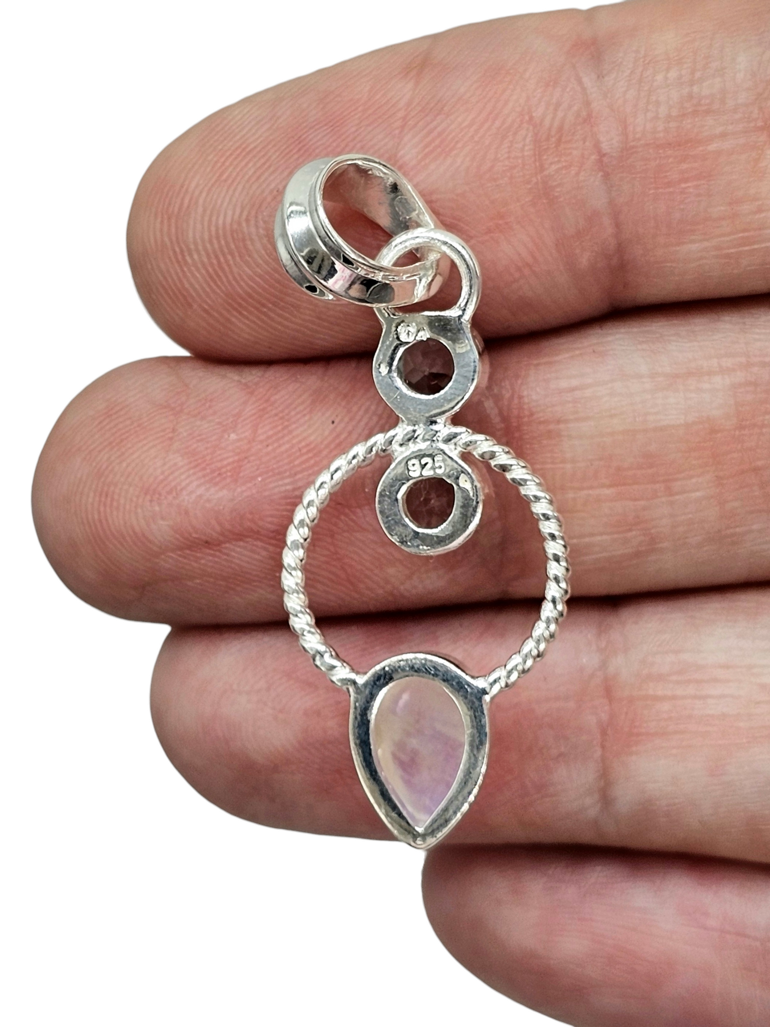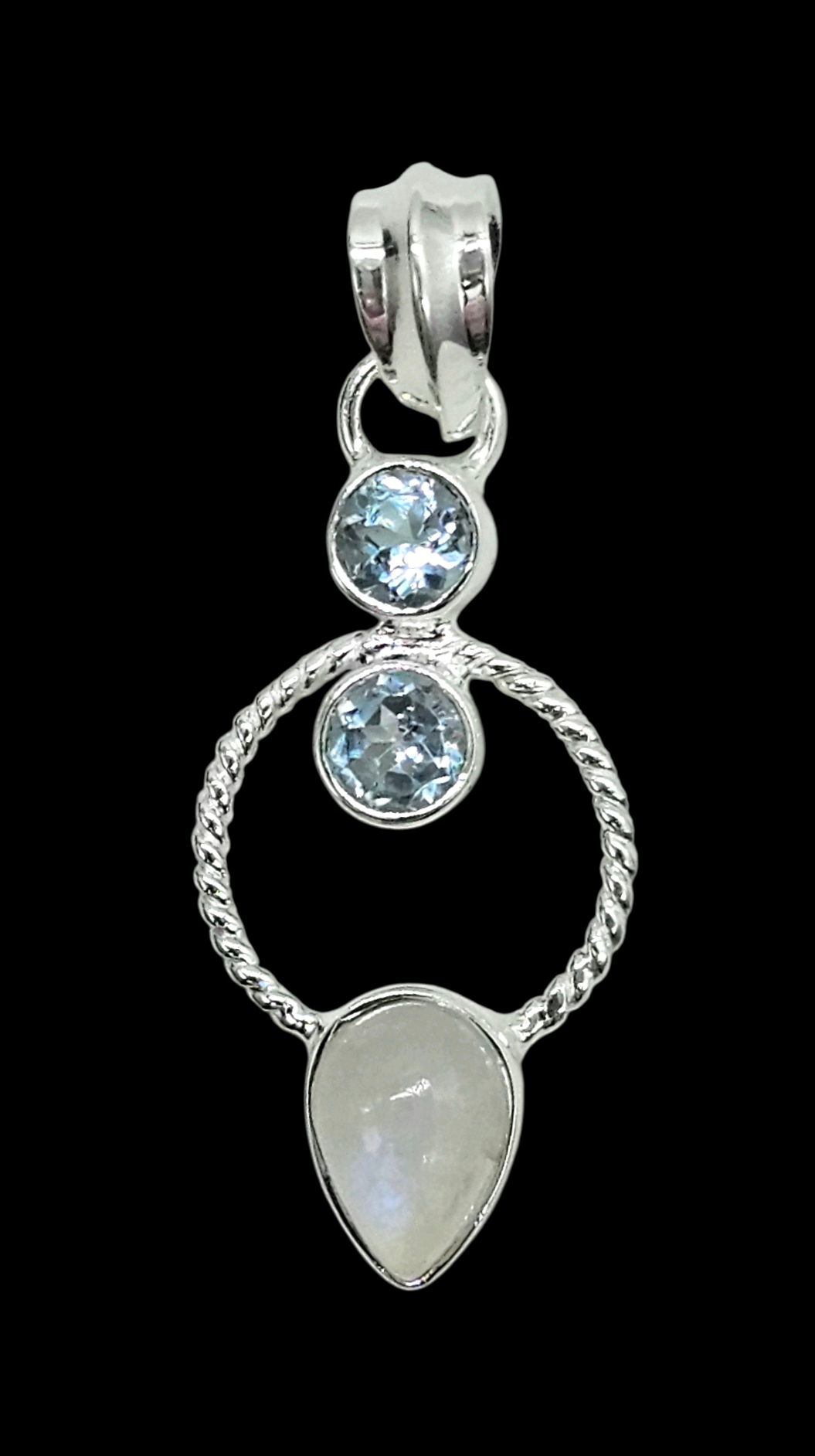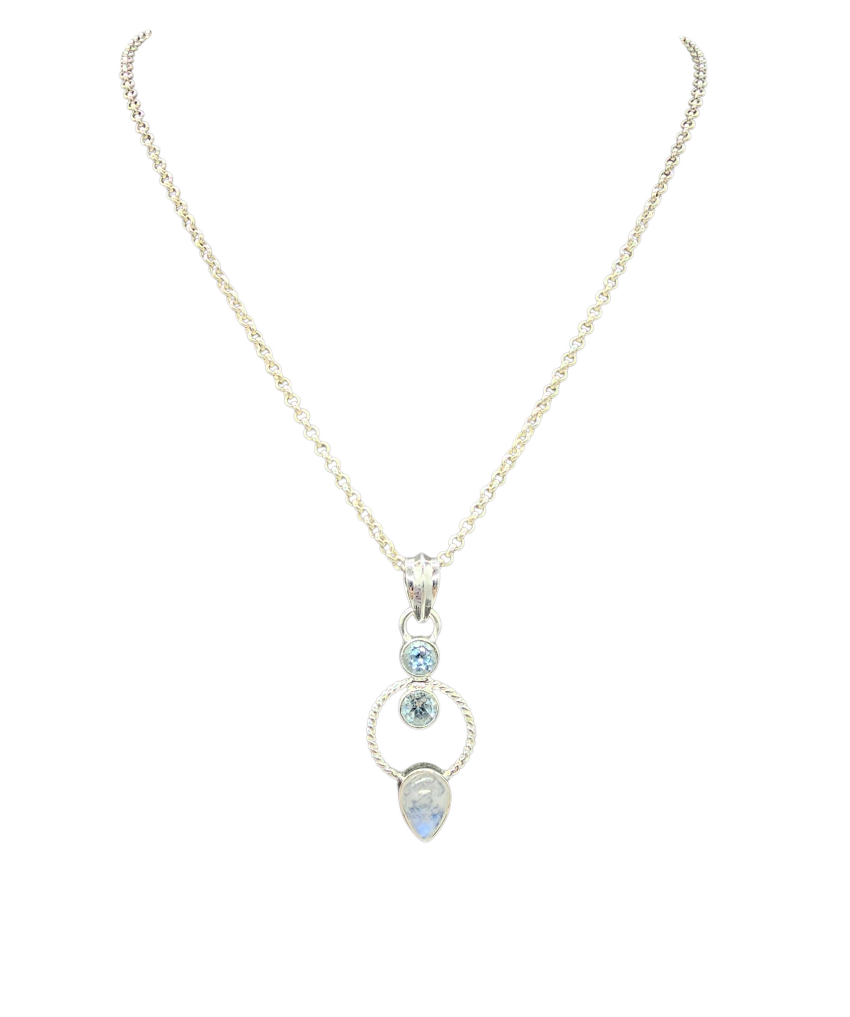 This Rainbow Moonstone & Blue Topaz pendant in 925 sterling silver is pure magic ✨ The luminous moonstone flashes with ethereal blue fire, beautifully framed by a delicate twisted silver circle, while sparkling blue topaz accents add a crisp, icy brilliance above. Elegant yet unique, this piece catches the light from every angle and feels effortlessly feminine—perfect for everyday wear or as a meaningful gift symbolising intuition, calm, and clarity. A true standout that looks even more stunning in person.