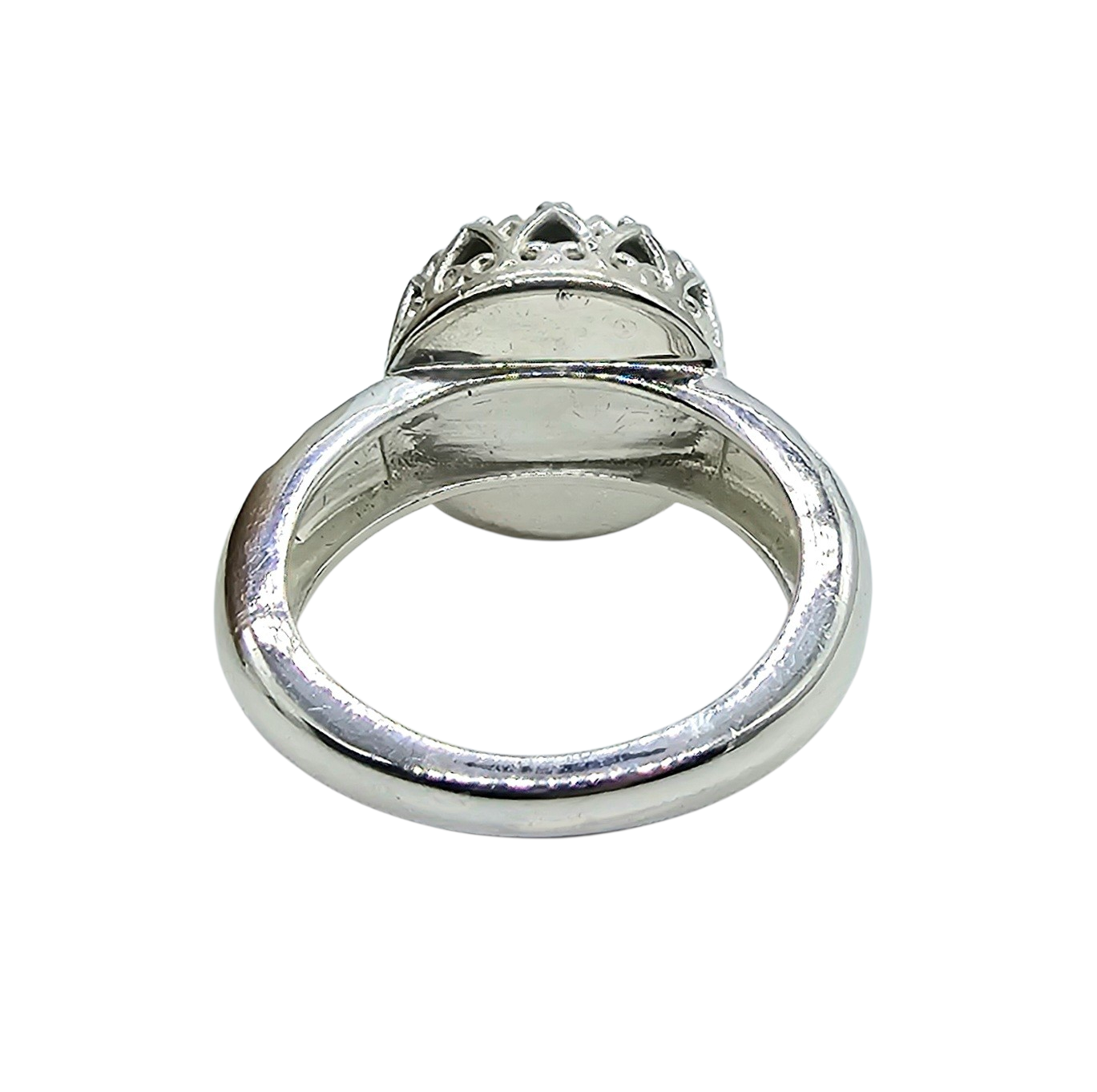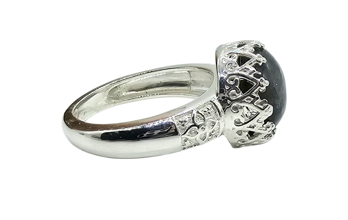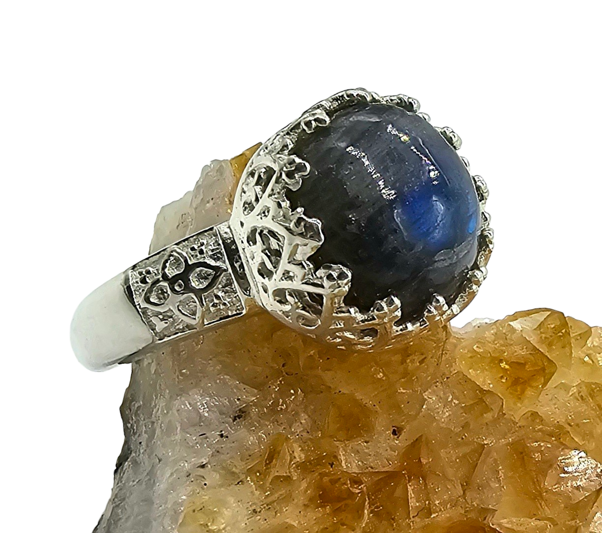 This eye-catching ring features a round labradorite centre stone, renowned for its striking blue "labradorescence" that shimmers against a dark, moody base. The gem is held securely in an ornate, crown-style gallery with delicate silver points, while the band is accented by textured, leaf-like carvings for a vintage, artisanal feel. Its ethereal glow and intricate metalwork make it a perfect statement piece for those who love a touch of celestial mystery.