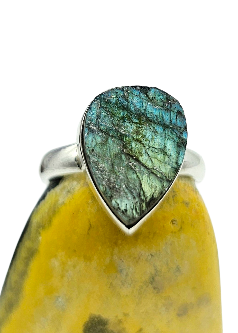 Rough Labradorite Ring, Size 9, Sterling Silver, Pear Shaped, Blue Green Labradorite, Deflects unwanted Energy - GemzAustralia
