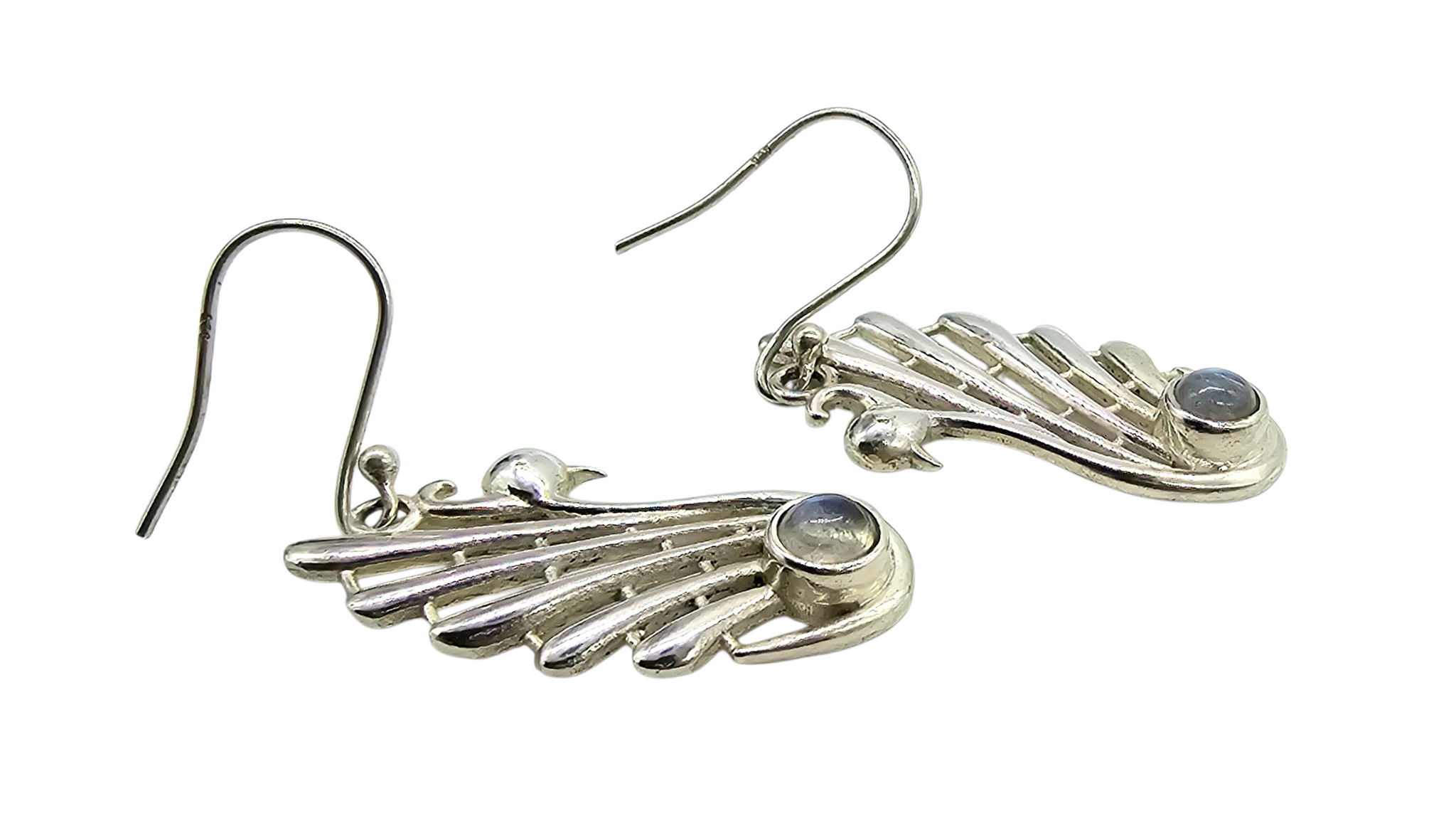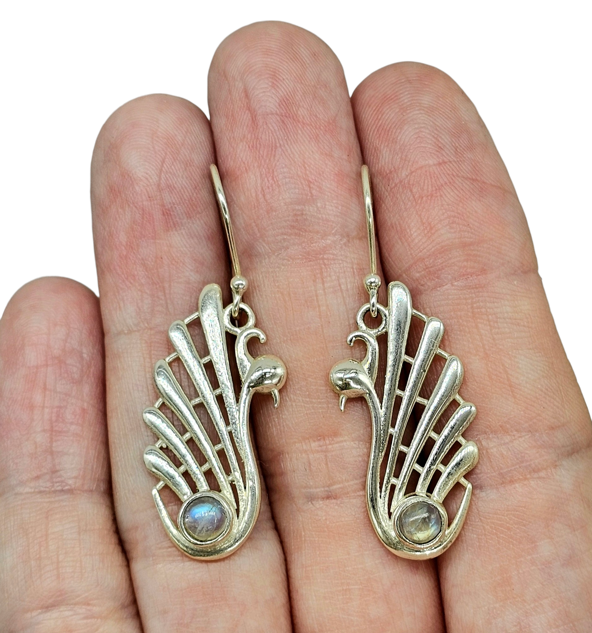 These stunning Labradorite earrings in sterling silver are pure magic. ✨ Sculpted into elegant, peacock-inspired forms, the flowing silver feathers catch the light beautifully, while the natural labradorite at the base flashes with mesmerising blues and soft greens every time you move. Known as a stone of intuition and transformation, labradorite adds depth and mystery—no two stones ever shimmer the same. Set in solid sterling silver and designed to sway gracefully, these earrings are statement pieces that feel both mystical and timeless.