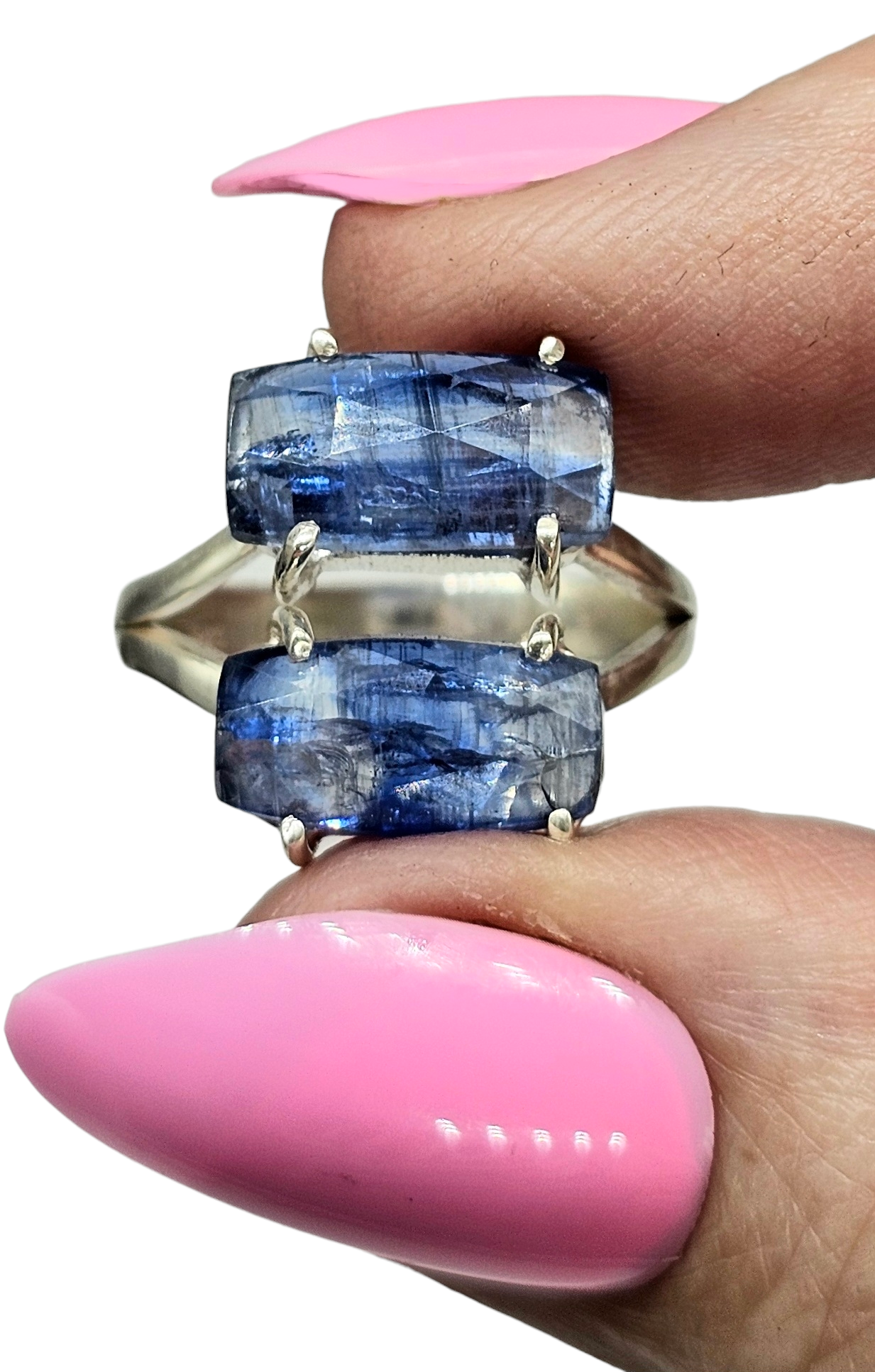 This stunning kyanite ring showcases two elongated, emerald-cut blue kyanite gemstones stacked in a striking vertical design.
