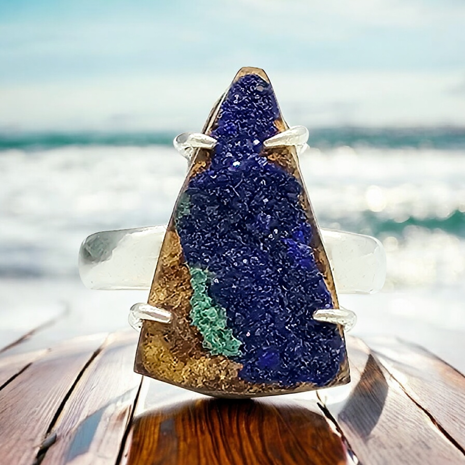 Raw Azurite Ring, size N, Sterling Silver, Triangle Shape, Rough Gemstone, Enhances Creativity, Third Eye Chakra, Electric Blue Gemstone