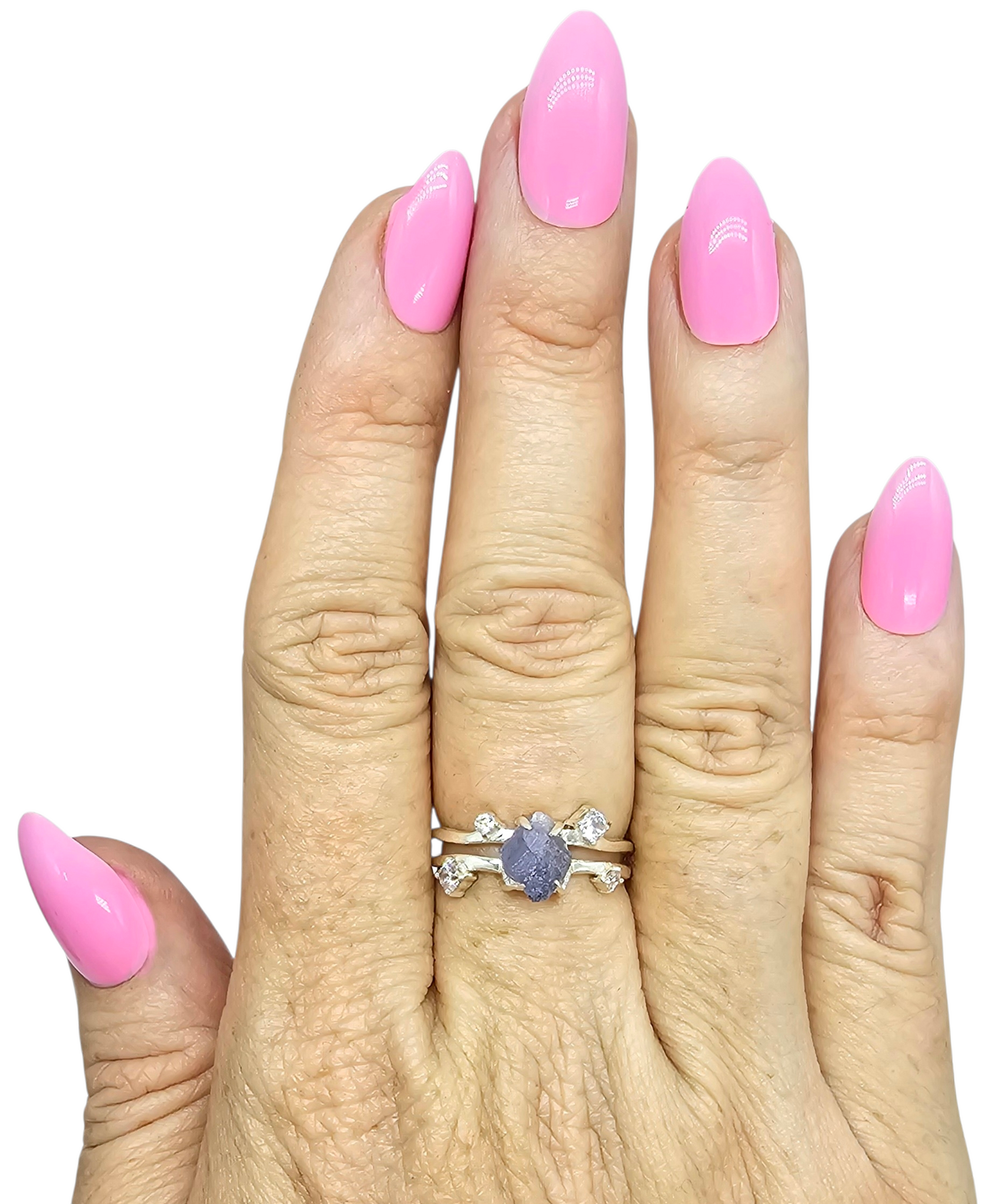 This striking ring is a celebration of refined rarity and modern luxury. At its heart sits a raw tanzanite crystal, left gloriously untamed to showcase its natural, ethereal beauty. Its soft violet-blue hue shifts subtly with the light, revealing the depth and mystery that makes tanzanite one of the world’s most coveted gemstones—found in only one place on Earth.