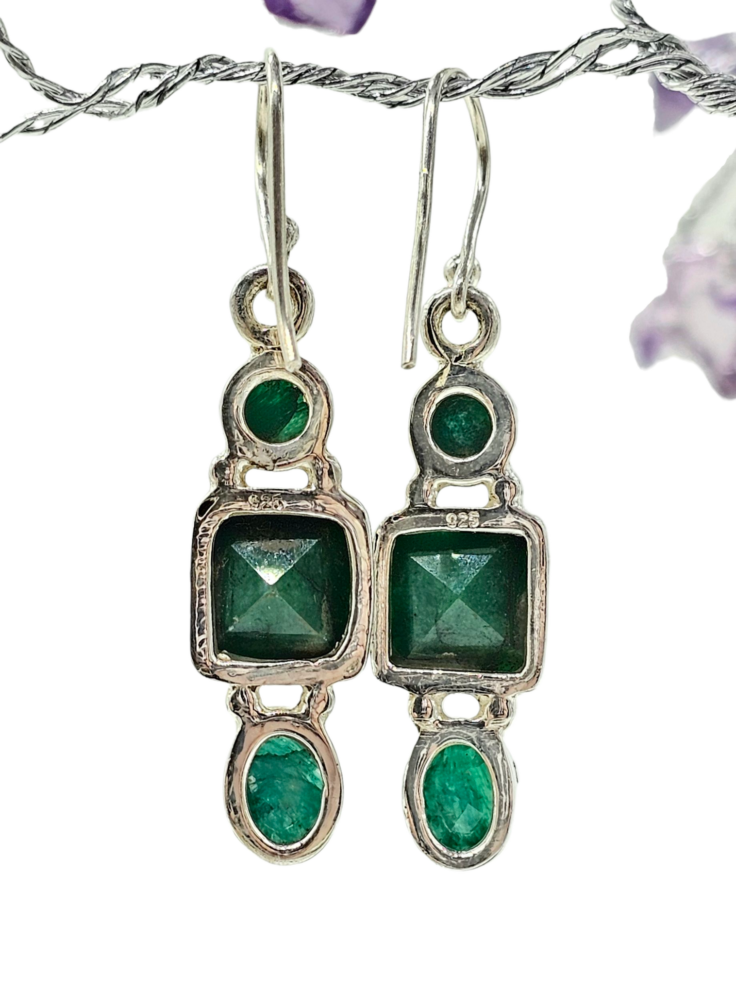 Green Emerald Earrings, May Birthstone, Three Stone Drop, Geometric Design, Inspiration Stone, Infinite Patience, Loyalty, Genuine Gemstones
