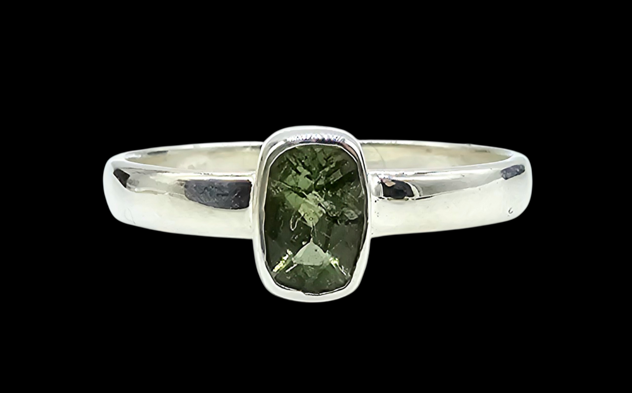 Faceted Moldavite Ring, Size 8, Sterling Silver, Meteorite Stone, Forest green / Olive green Gem, Holy Grail Stone, Psychic Protection