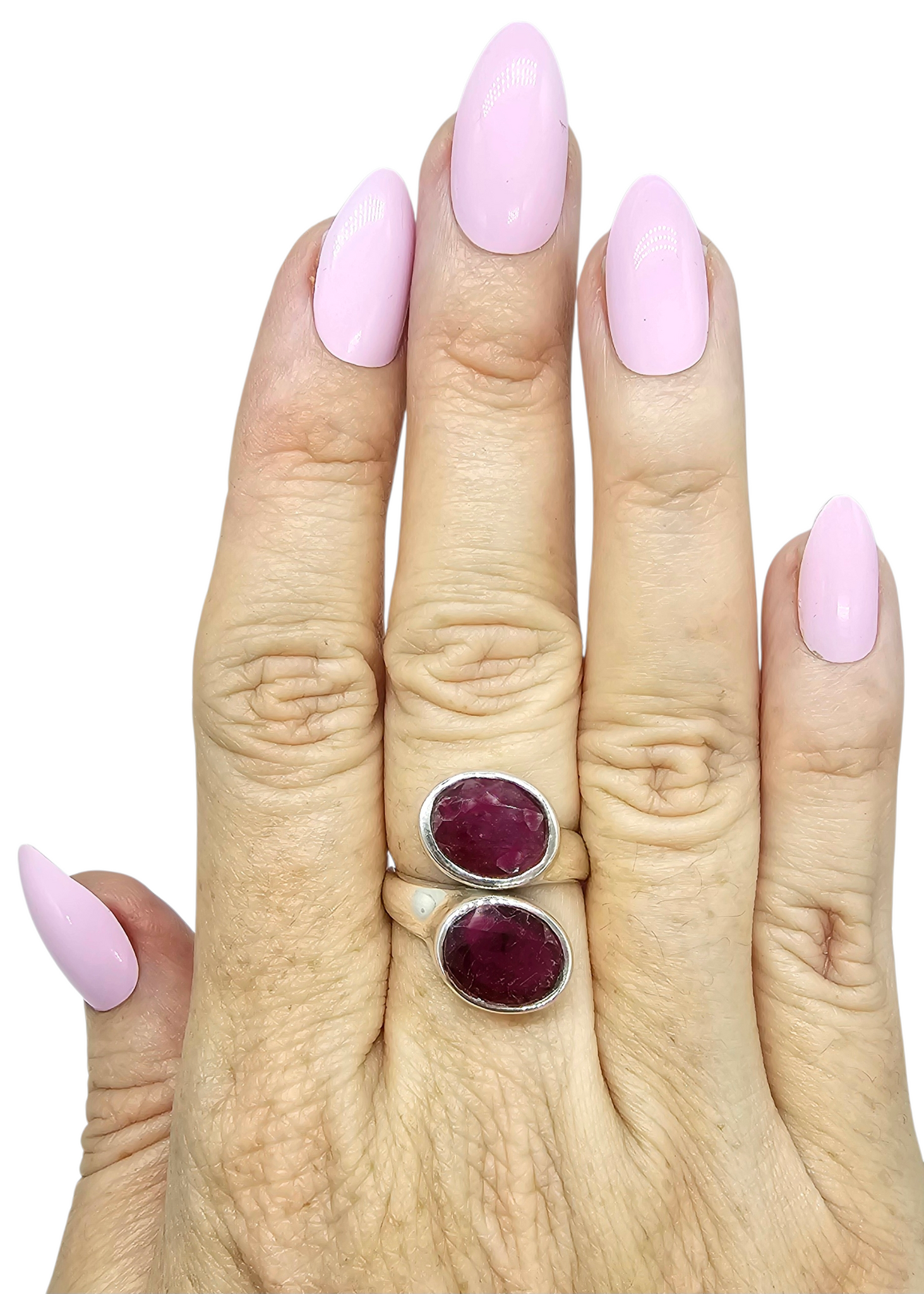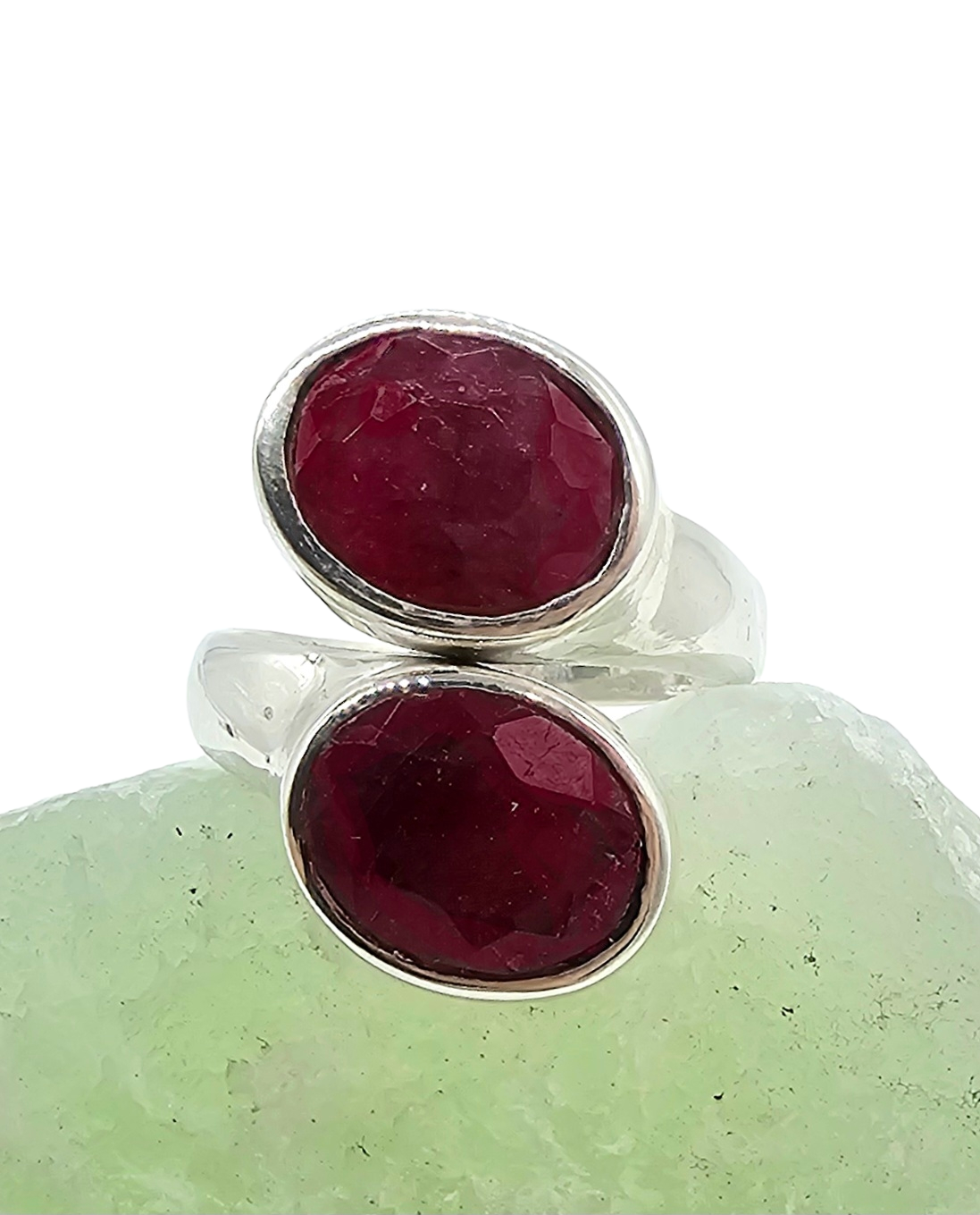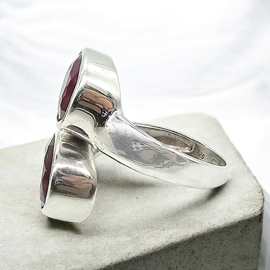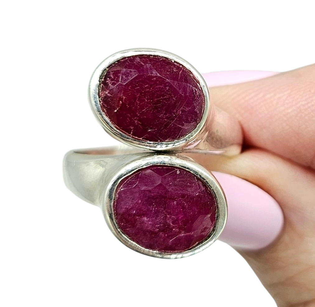 This stunning Burmese ruby ring in solid sterling silver features two rich, deep-crimson rubies stacked in a bold, modern design that immediately draws the eye. The natural stones glow with intense colour and organic inclusions, celebrating their beauty, while the smooth silver bezel settings add a refined, timeless finish. Powerful yet elegant, this ring is a striking statement piece made for those who appreciate rare gemstones and confident style ❤️